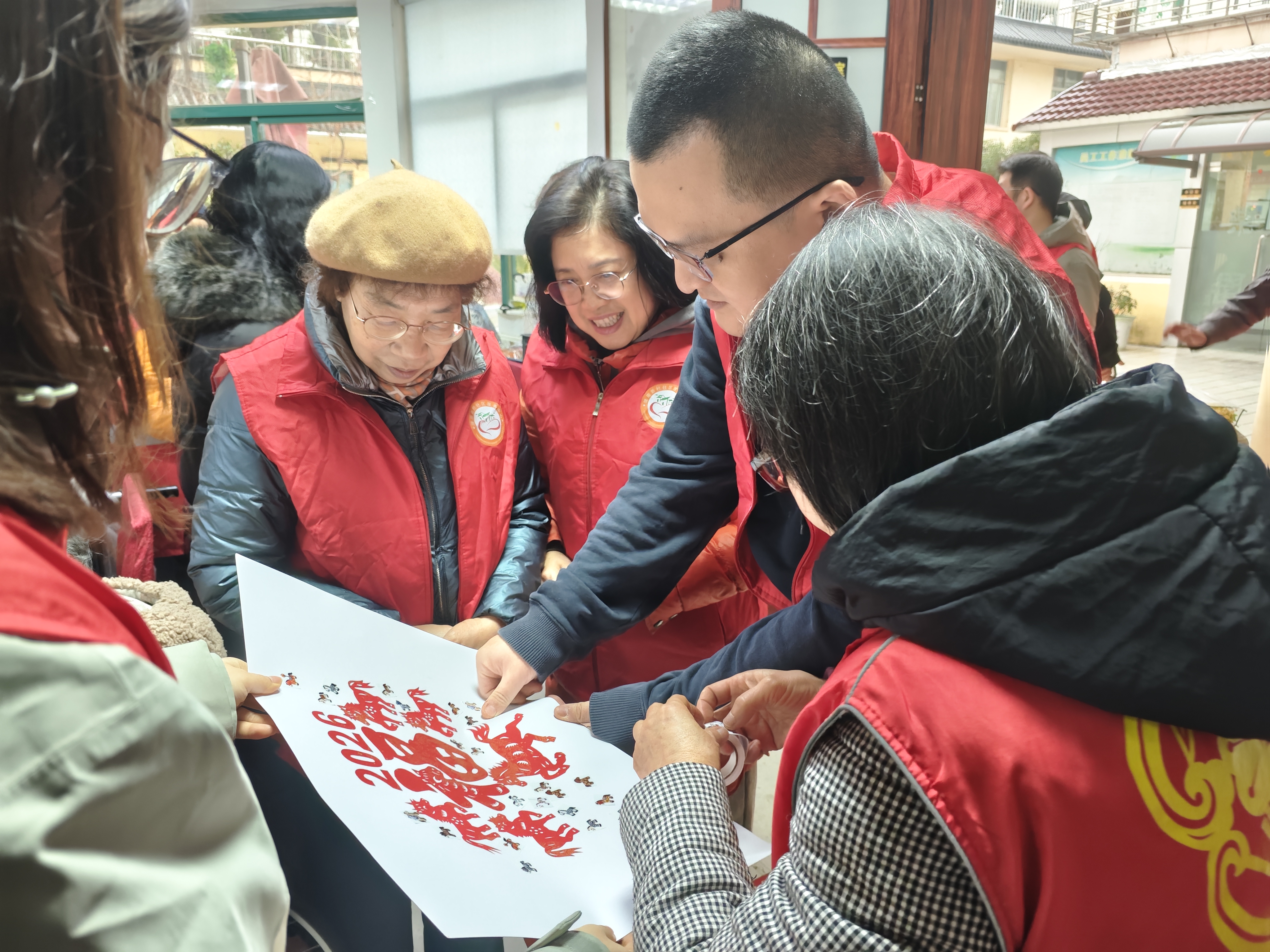 活动现场暖意融融,非遗传承成为节日里的别样风景。来自辖区三友非遗传承工作室的老师现场授课,二支部民盟盟员陆轶凡、张频、曹幸作为志愿者与老人们围坐一堂,共同创作马年剪纸画。志愿者们耐心细致地协助老人折纸、描线、裁剪,手把手传授剪纸技巧,与老人们交流马年民俗寓意。老人们精神矍铄,专注投入创作,指尖流转间,一幅幅造型生动的骏马剪纸、寓意吉祥的福字窗花相继成型。剪刀开合的清脆声、老人们的欢声笑语与志愿者的暖心叮嘱交织,让托老所充满了浓浓的节日氛围。